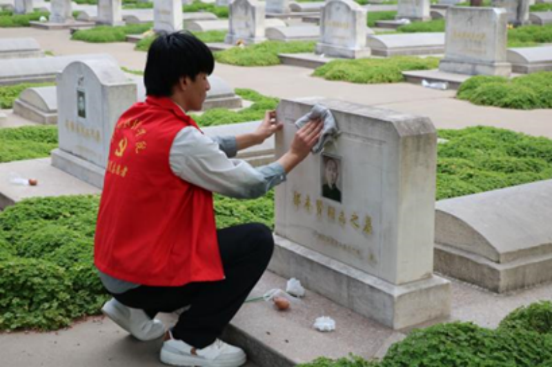 志愿者擦拭烈士墓碑